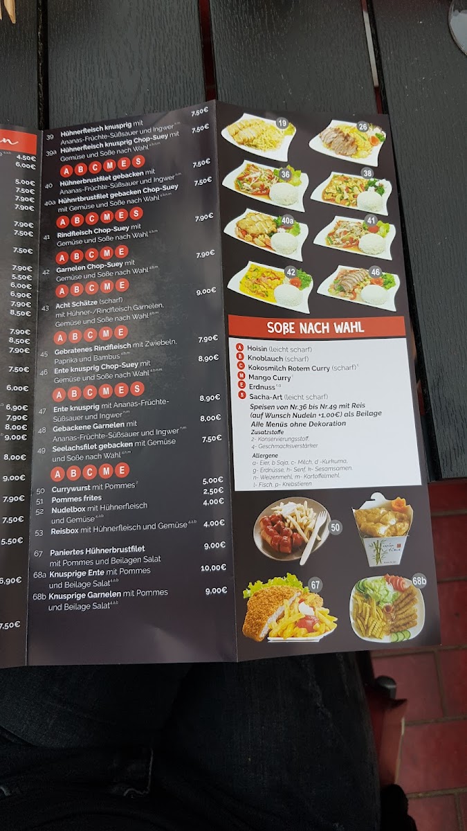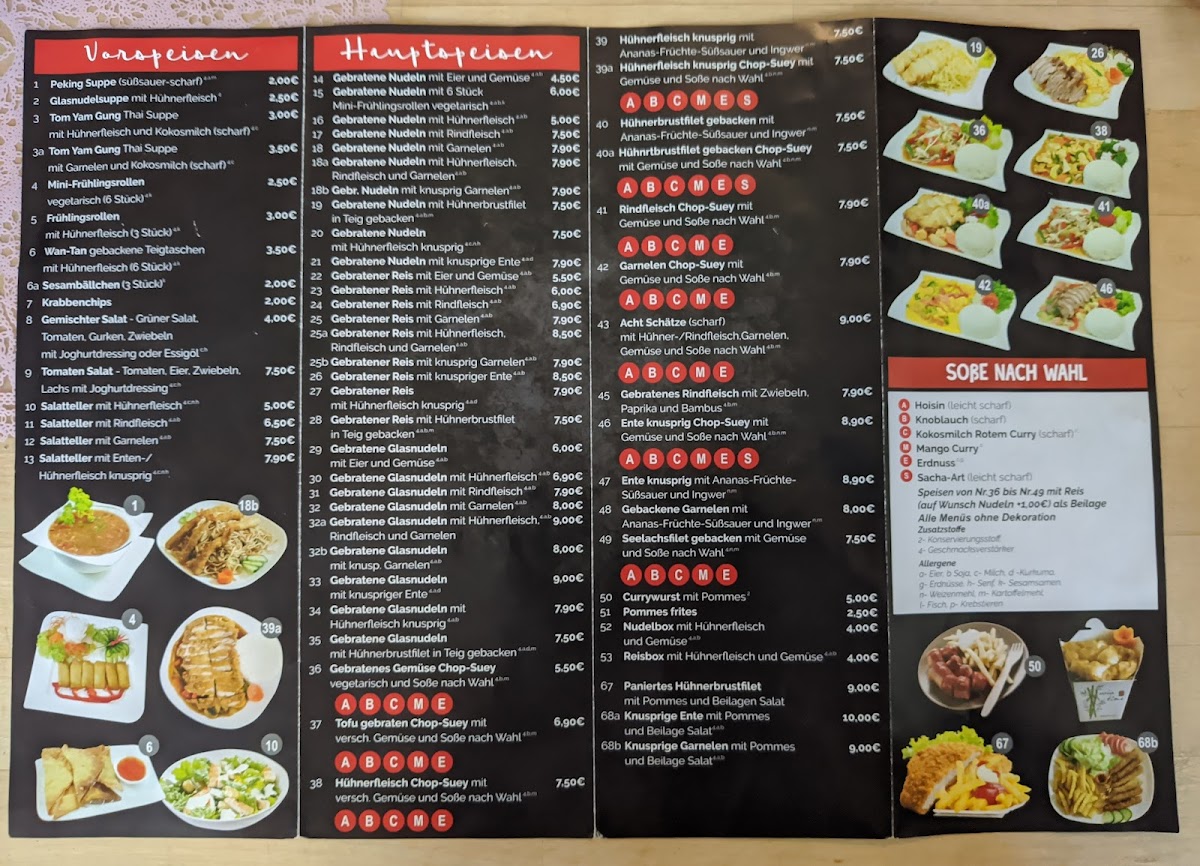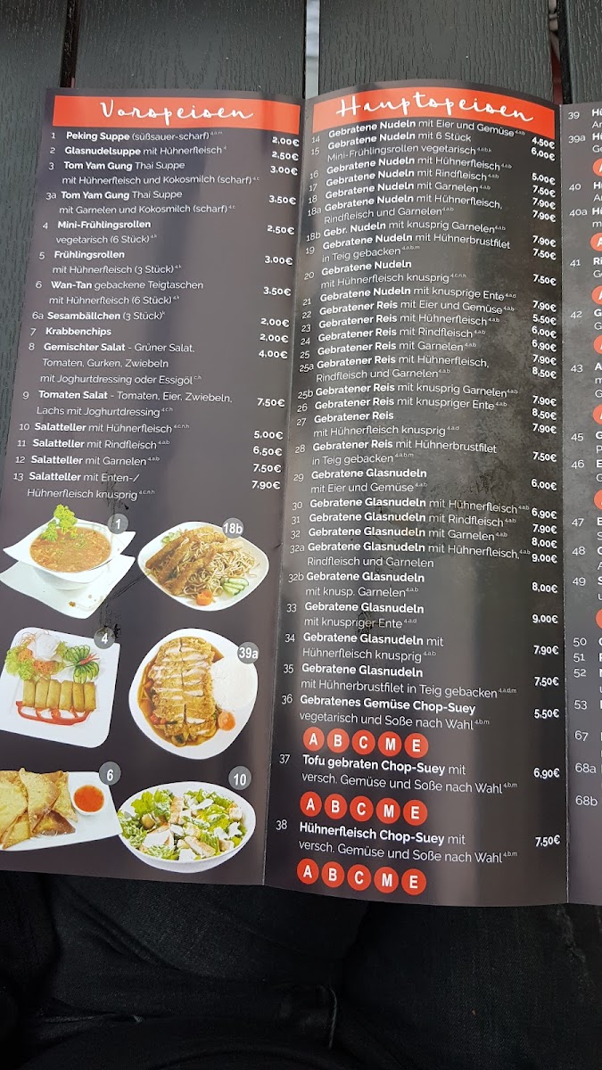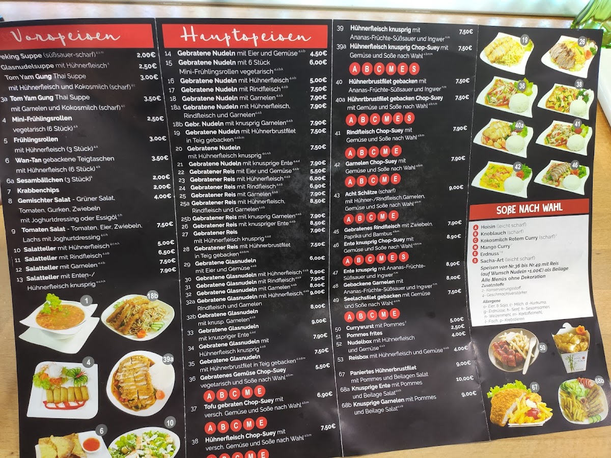 The menu offers a variety of Asian dishes focusing primarily on Thai and Japanese cuisine. Visitors will find options including curries, sushi, tempura, and stir-fried dishes. Typical menu highlights include dishes such as Thai Mango Curry, Special Tempura Roll, Garnelen mit Gemüse (shrimp with vegetables), Lachs Sushi Tempura (salmon sushi tempura), and multiple duck preparations including crispy duck chop suey with spicy garlic sauce, sweet and sour duck with shrimp, and duck mango curry with rice.